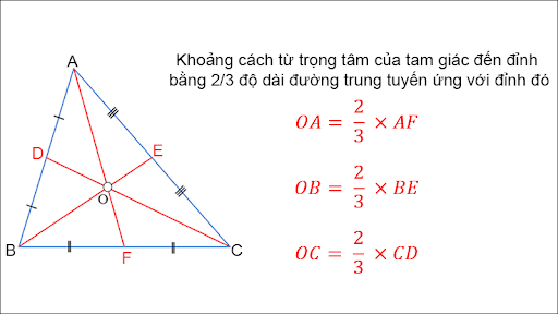 - Khoảng cách từ trọng tâm của tam giác đến đỉnh bằng 2/3 độ dài đường trung tuyến ứng với đỉnh đó.