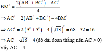 Bài 3: Cho tam giác ABC có AB = 3, BC = 5 và độ dài đường trung tuyến BM= 13, Độ dài AC là: