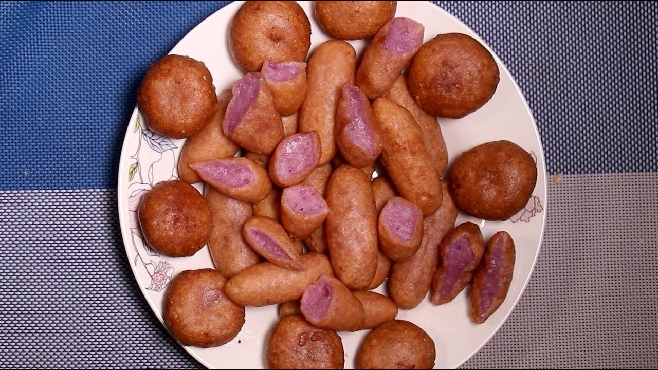 Khoai lang tím mua về rửa sạch và hấp chín. Sau đó lột vỏ và tán khuyển thành bột. Thêm vào bột khoai lang tím 40 gram bột mì và lượng đường cát trắng vừa ăn, trộn đều và nặn thành từng viên kén bằng khoảng một ngón tay cái. Lăn kén qua 20 gram bột mì còn lại để tạo độ kết dính.